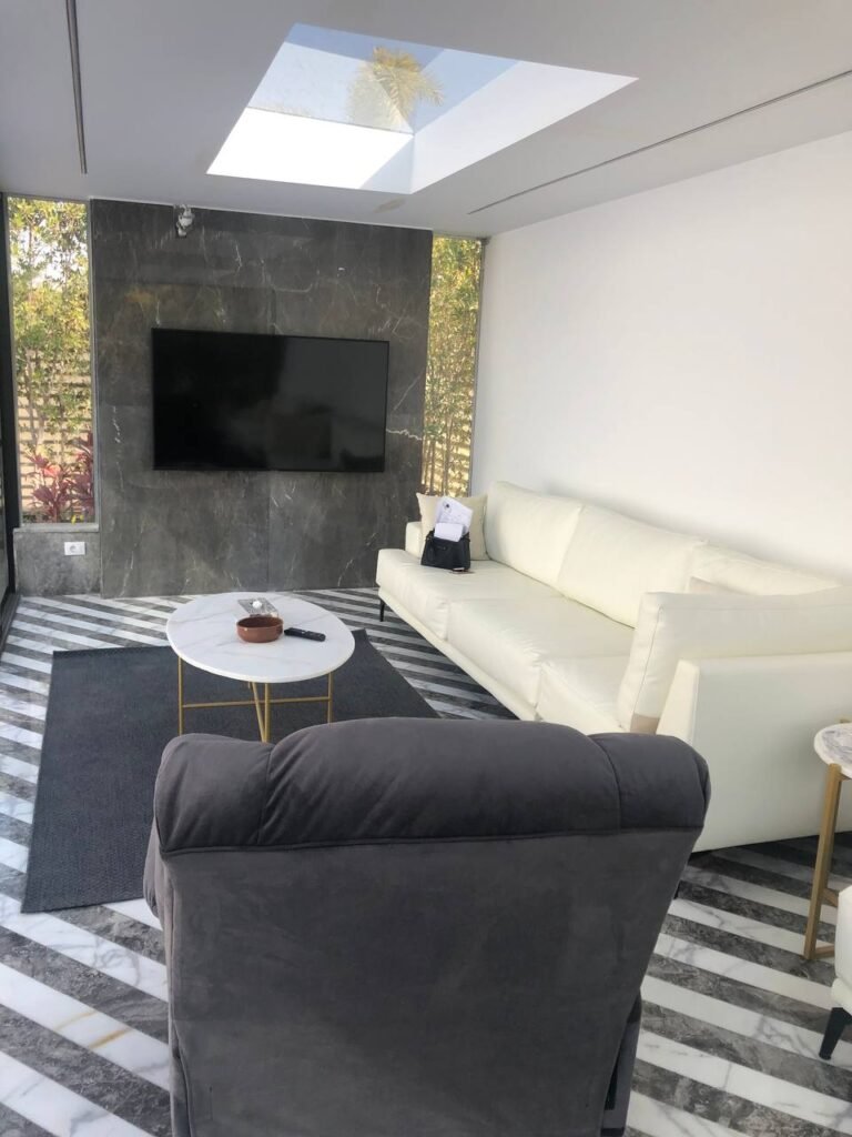 The living room in the Katameya Dunes villa, beautifully designed by **T-Square Interiors**, exudes a seamless blend of sophistication and warmth. With its minimalist approach, the space is enriched by a careful selection of high-end materials, including luxurious marble, sleek flooring, and intricate mosaic details. The smooth, consistent paintwork adds to the expansive feel, creating a welcoming and tranquil environment. This thoughtfully crafted space strikes a perfect balance between elegance and comfort, making it an ideal spot for both unwinding and entertaining guests in style.
