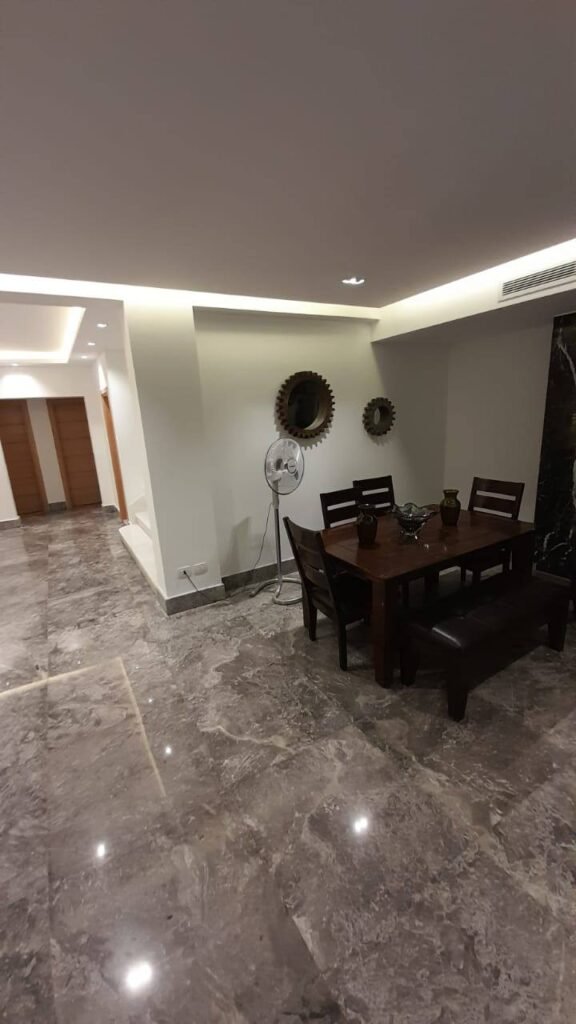 The living room in the Marina 5 villa, skillfully designed by **T-Square Interiors**, captures the perfect harmony of luxury and comfort. The room’s clean, minimalist aesthetic is elevated by the thoughtful combination of premium materials, from elegant marble to chic flooring and detailed mosaic accents. The seamless paintwork enhances the open feel of the space, creating a serene and inviting ambiance. This well-curated environment offers the ideal setting for both peaceful relaxation and stylish gatherings.