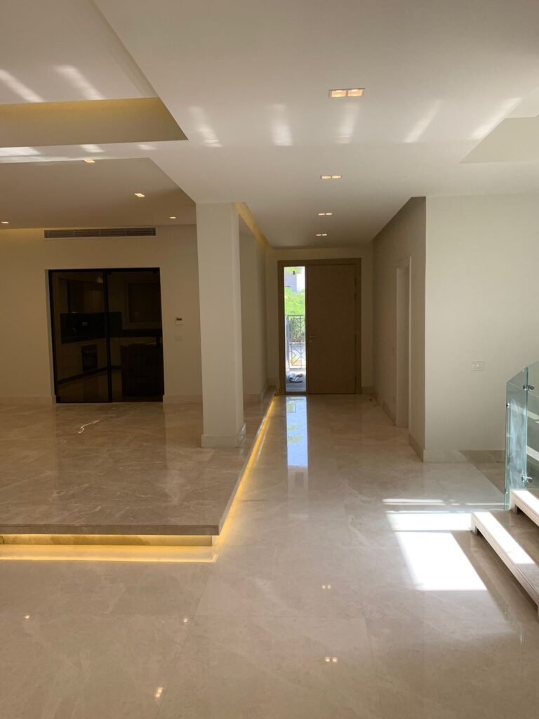 The living room in the New Giza villa, expertly crafted by **T-Square Interiors**, showcases a stunning blend of elegance and comfort. This space embodies simplicity in design while integrating a diverse array of finishing materials, including exquisite marble, stylish flooring, and intricate mosaic tiles. The uniform paint enhances the spaciousness, creating an inviting atmosphere that radiates luxury and tranquility, making it the perfect setting for relaxation and entertaining.